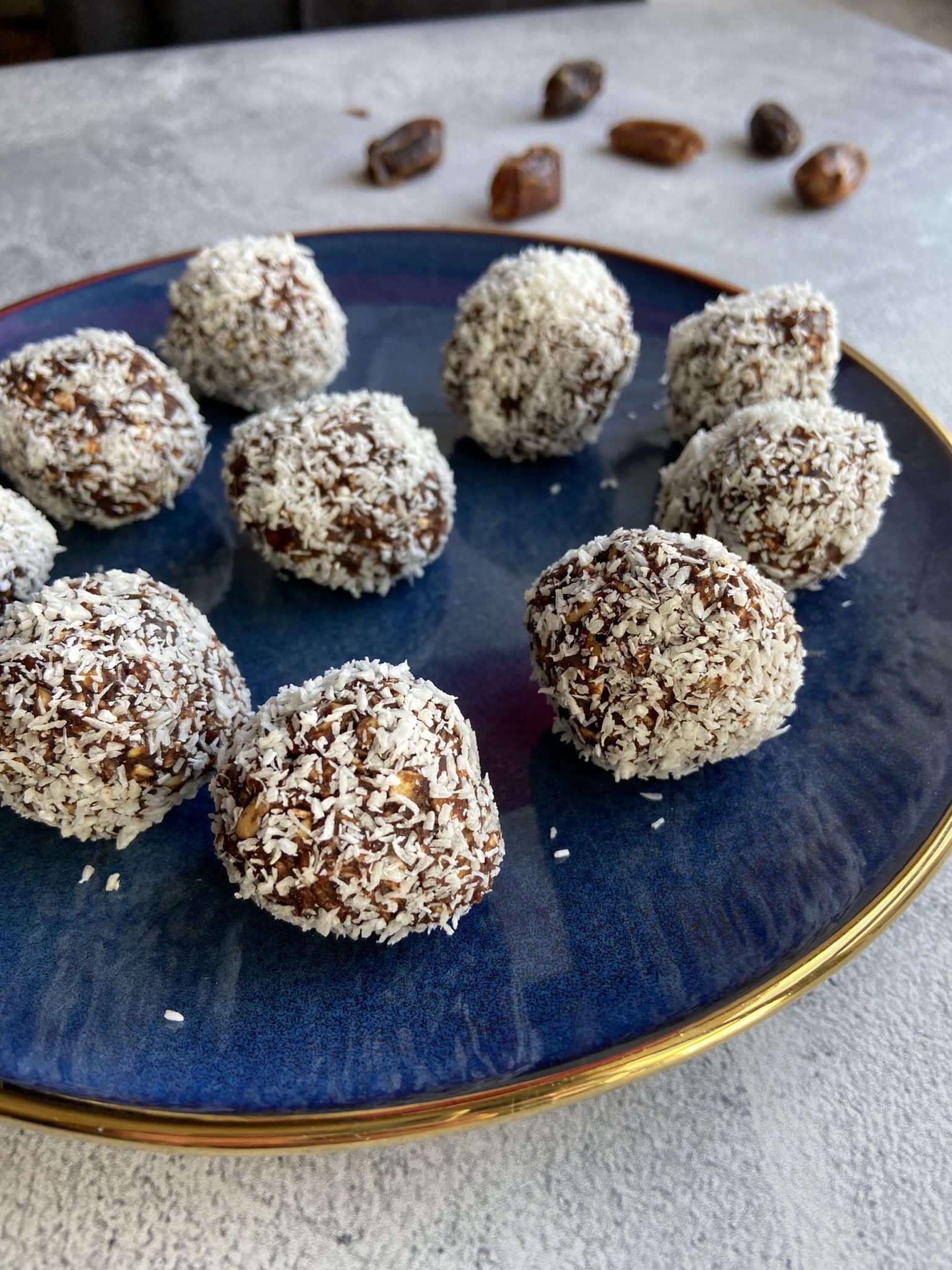 Daktyle namocz we wrzątku. Płatki drobno zmiel. Namoczone daktyle zblenduj na gładką masę (w razie potrzeby dodaj trochę wody). Do masy dodaj mąkę z płatków, 2-3 łyżki wody oraz kakao. Wszystkie składniki wymieszaj i uformuj kulki. Obtocz w wiórkach kokosowych i wstaw do lodówki na 30 minut.