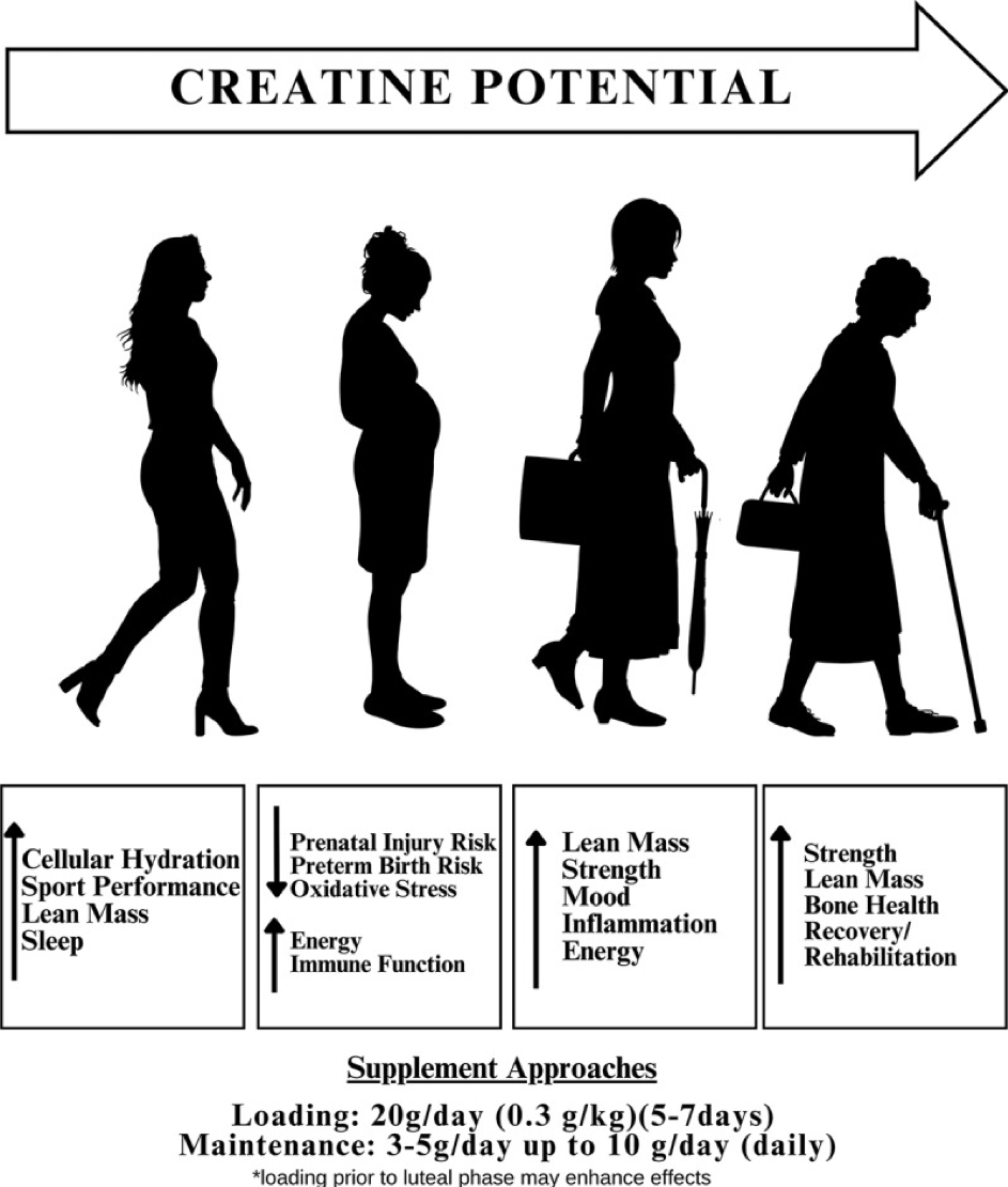 Okazuje się, że suplementacja kreatyną przynosi wiele korzyści dla kobiet w każdym wieku. Świetnie obrazuje to poniższa grafika z artykułu, mówiąca że suplementacja kreatyną u kobiet: