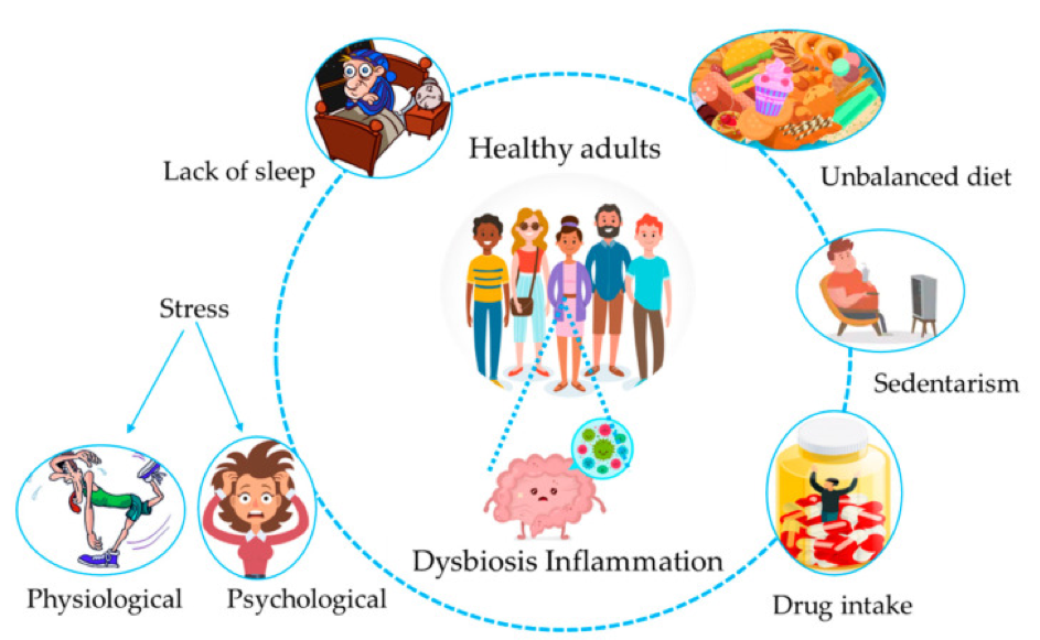 AKTYWNOŚĆ FIZYCZNA – Osoby aktywne fizycznie mają zmieniony mikrobiom jelitowy. Różna intensywność ćwiczeń wpływa w różny sposób na mikrobiotę jelitową. Zazwyczaj osoby aktywne fizycznie, zdrowej się odżywiają, co widać u elitarnych sportowców, którzy mają metabolicznie korzystny mikrobiom jelitowy powstały w wyniku wieloletniego optymalnego odżywiania i wysokiej kondycji fizycznej. Umiarkowany wysiłek może korzystnie wpływać na funkcje bakterii, na co wskazuje wyższy poziom maślanu, który bierze udział w regulacji poziomu cholesterolu, glukozy i lipidów. Dodatkowo dochodzi do produkcji jelitowych IgA i poziomu niektórych limfocytów, a także skrócenie czasu pasażu jelitowego.